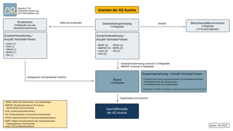 Gemäß § 4 Abs. 1 HS-QSG idgF ist geregelt, dass die Organe der AQ Austria das Kuratorium, das Board, die Generalversammlung und die Beschwerdekommission sind.